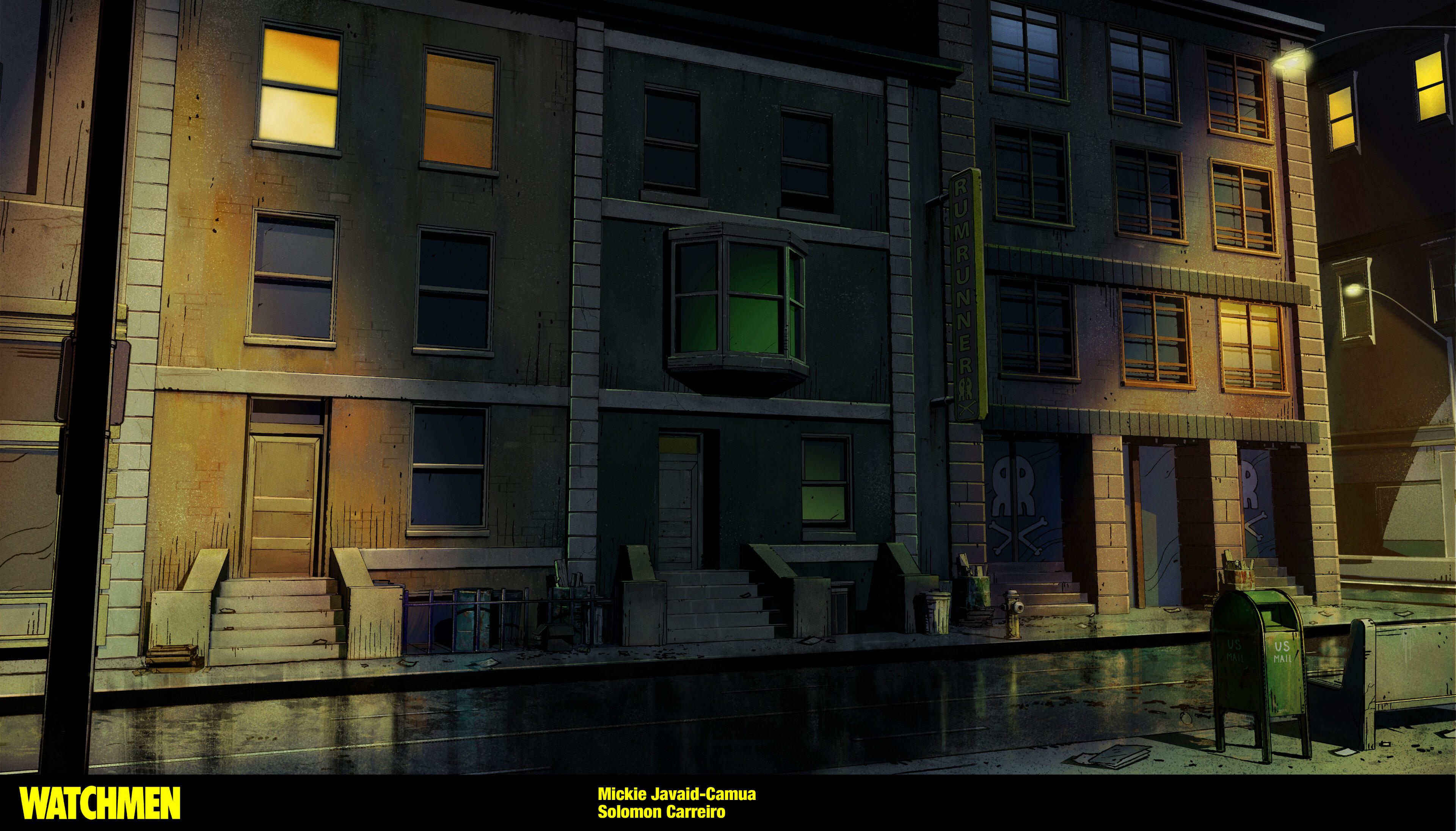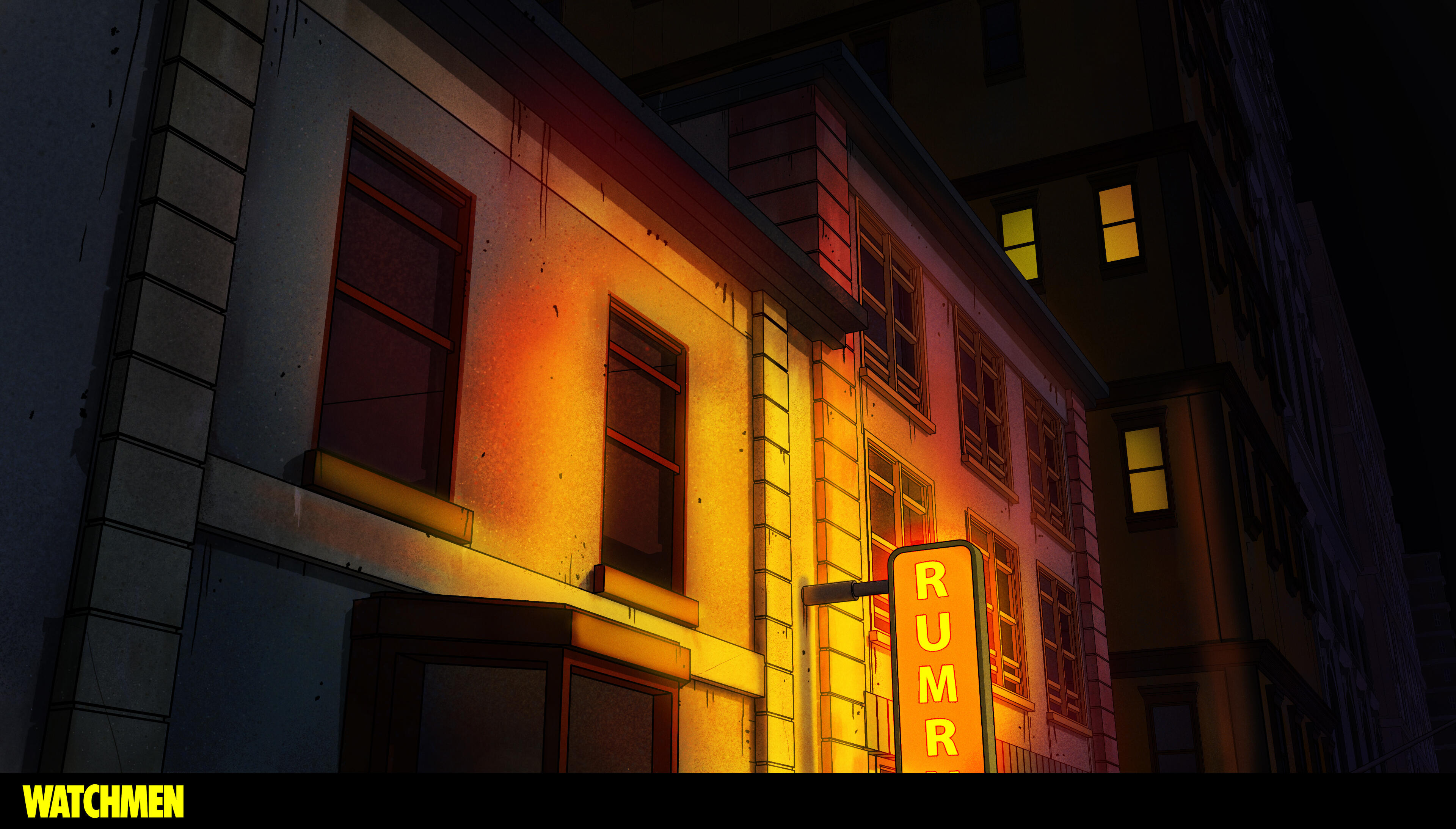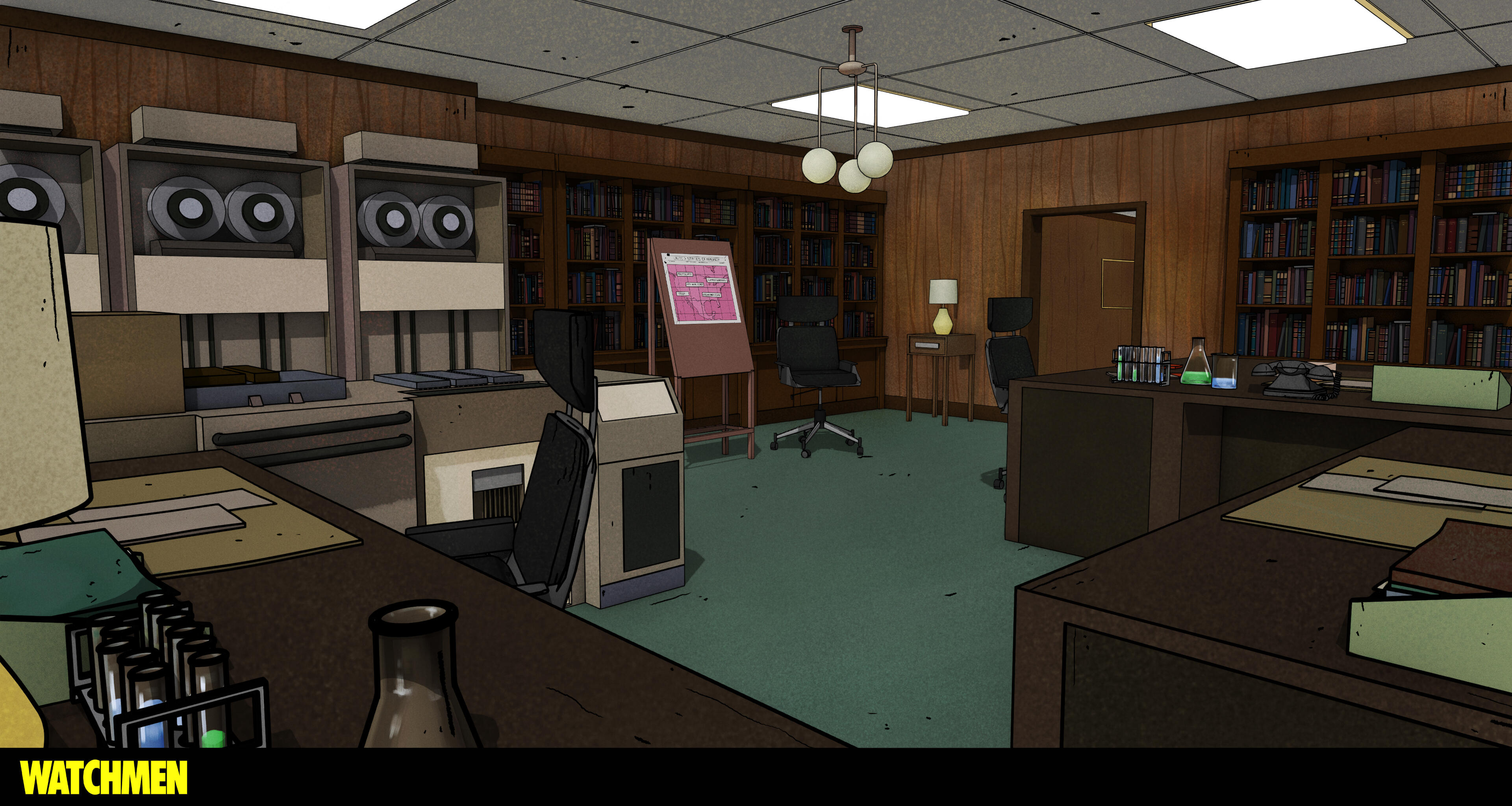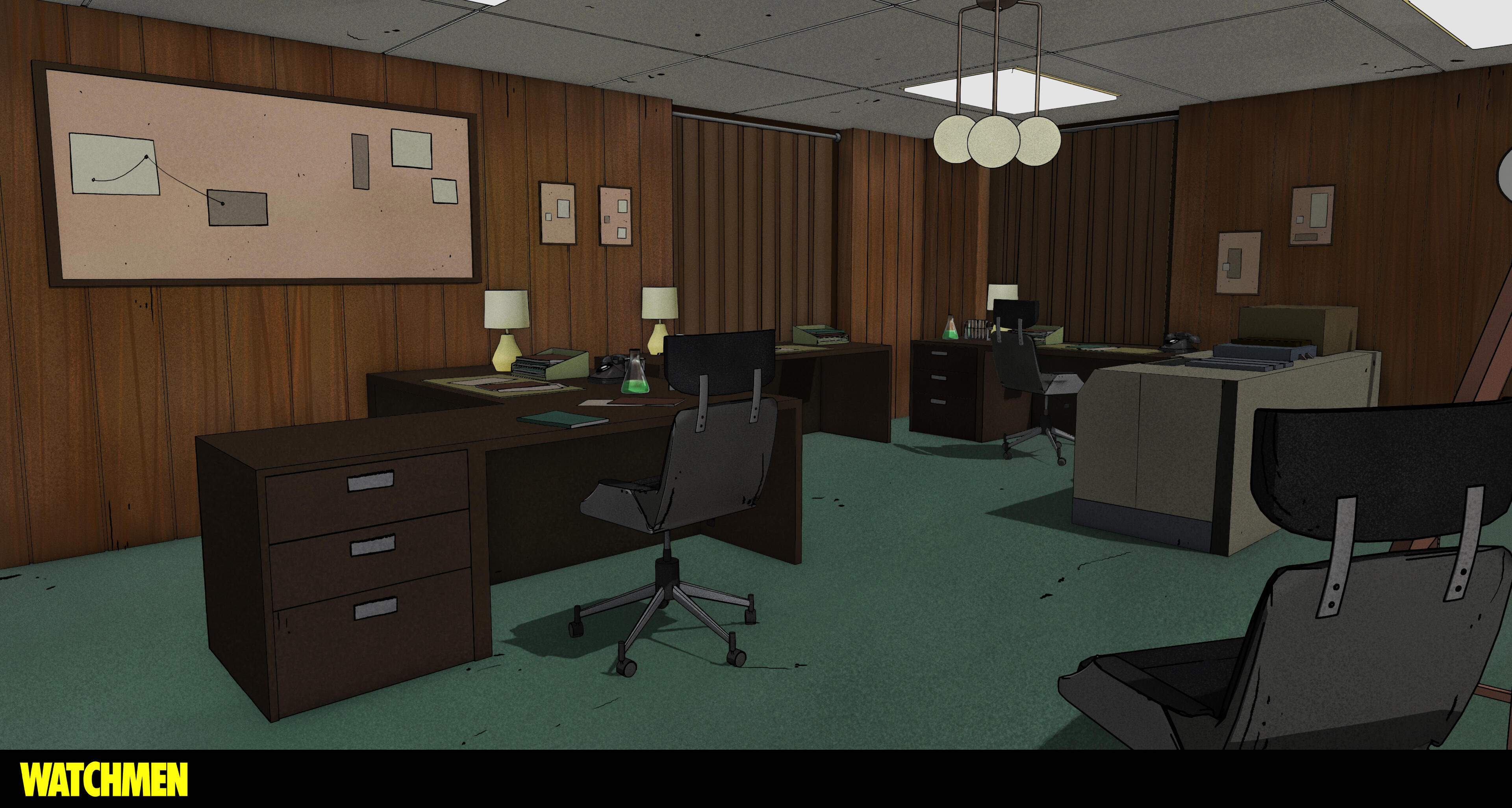 At Warner Bros. Animation I worked on Watchmen: Chapter I and II (2024) as a visual development artist. I painted backgrounds, textures, designed and painted props, created graphics, VFX and sky textures.