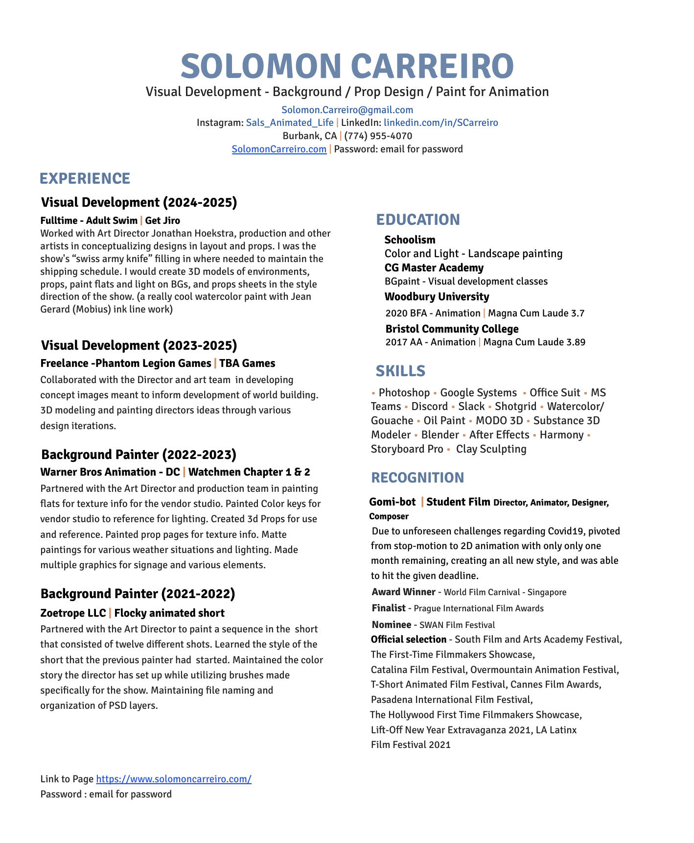 Photoshop • Google Systems • Office Suit • MS Teams • Discord • Slack • Shotgrid • Watercolor/Gouache • Oil Paint • MODO 3D • Substance 3D Modeler • Blender • After Effects • Harmony • Storyboard Pro • Clay Sculpting